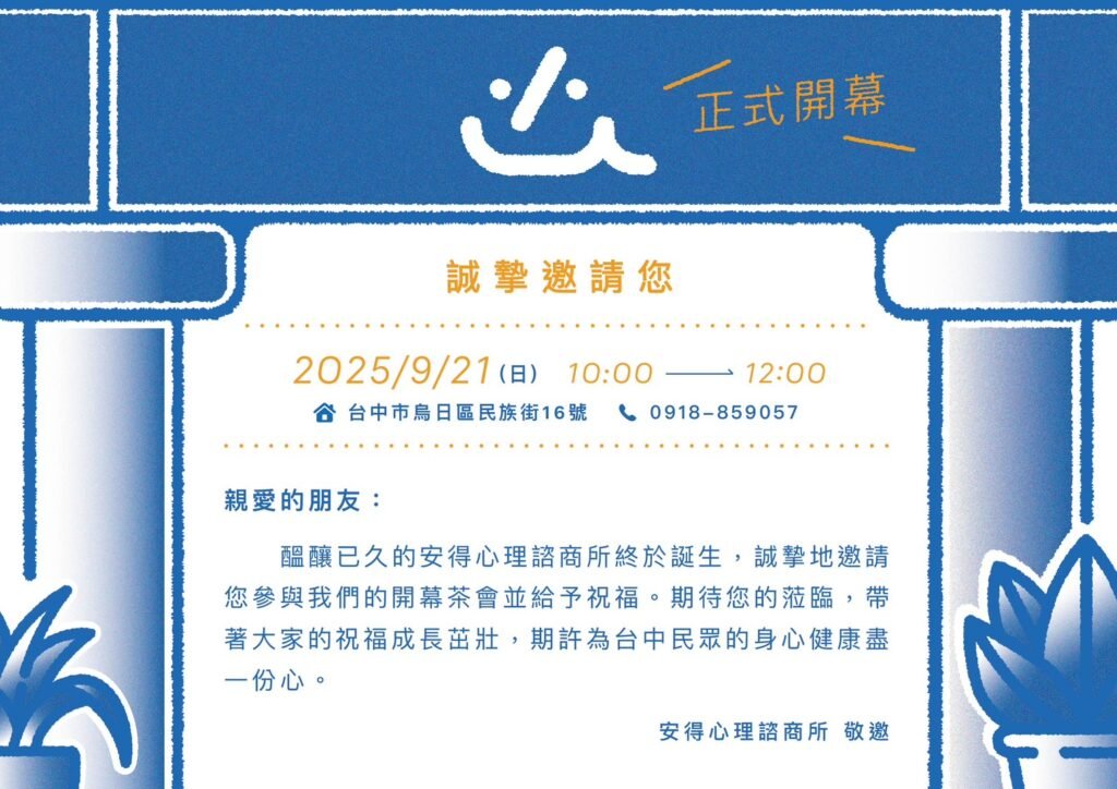 安得心理諮商所將在2025/9/21(日)上午10點-12點舉辦開幕茶會。歡迎大家一同參加,帶著大家的祝福,讓我們一起朝向更舒適也更安心的前進。期待與大家相見 即日起可以開始預約,可透過表單、官方LINE或電話洽詢預約,點擊左下方進行預約。